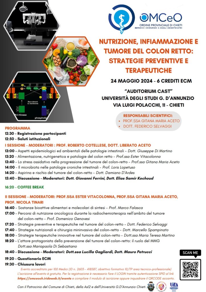 Un convegno su “Nutrizione, infiammazione e tumore del colon-retto: strategie preventive e terapeutiche” è in programma il prossimo 24 maggio nella sala convegni Cast del campus universitario di Chieti. A promuoverlo è l’Ordine dei medici chirurghi ed odontoiatri della provincia di Chieti